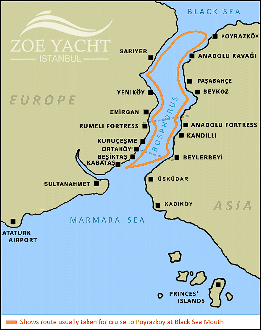 Click the map to enlarge and view the route usually taken for this Bosphorus cruise to Black Sea as far as Poyrazkoy: