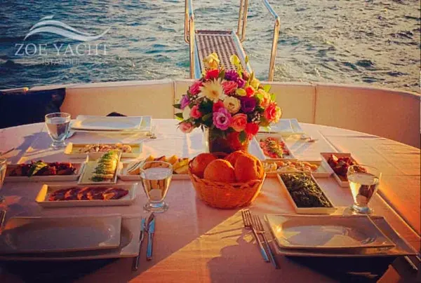 - Dinner Menus are specially catered exclusively for Zoe Yacht providing freshly cooked fish and selected seafood, meat and vegetable varieties, provided by well-established and reputable Bosphorus restaurants (according to the time and location of your cruise).